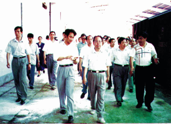 2000年7月,时任湖南省委书记杨正午(前排右一),视察岳阳岳泰科技饲料有限公司。