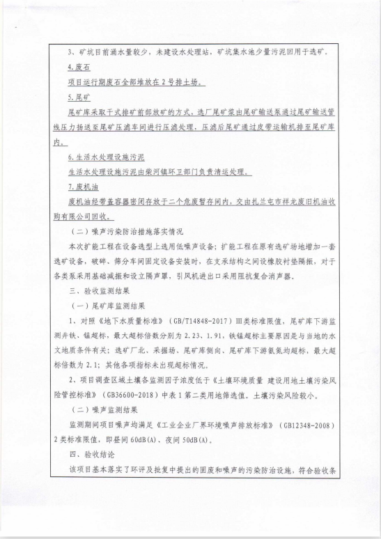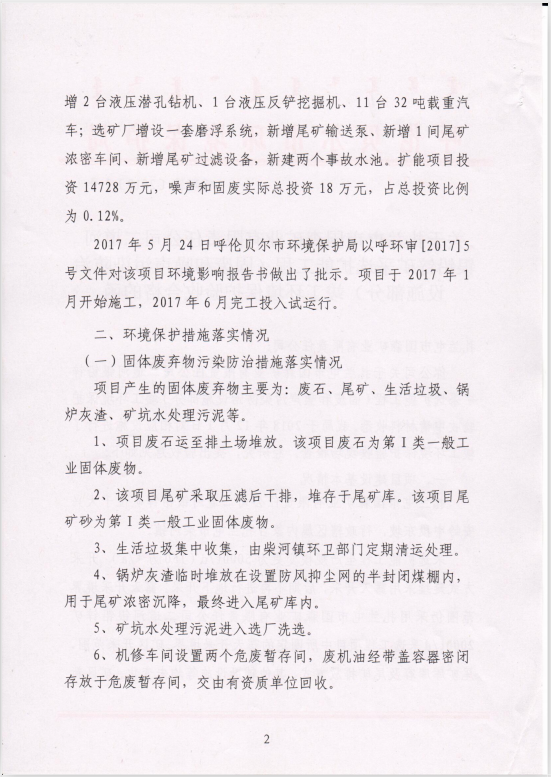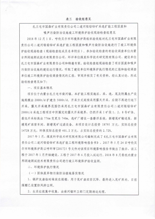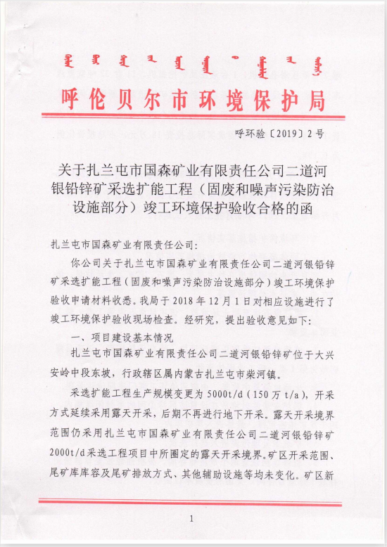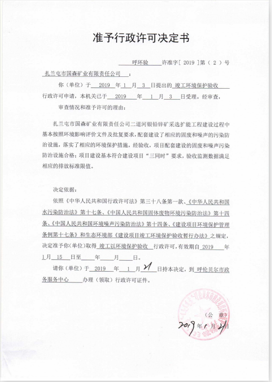 扎兰屯市国森矿业有限责任公司二道河二期环评验收合格的函、准予行政许可决定书、验收组的意见