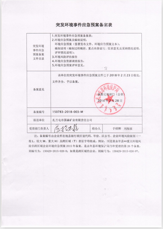 扎兰屯市国森矿业有限责任公司二道河矿区突发环境应急预案备案表2018年